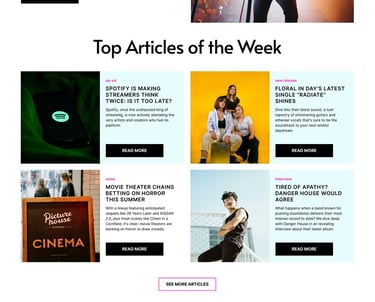 My first goal was to ensure the user interface was easy to read and navigate. I designed the typography and layout to be clean and simple, putting the focus squarely on the content (the interviews, reviews, and articles themselves). To keep the experience from being bland, I made a conscious choice to infuse the UI with splashes of artificial color.